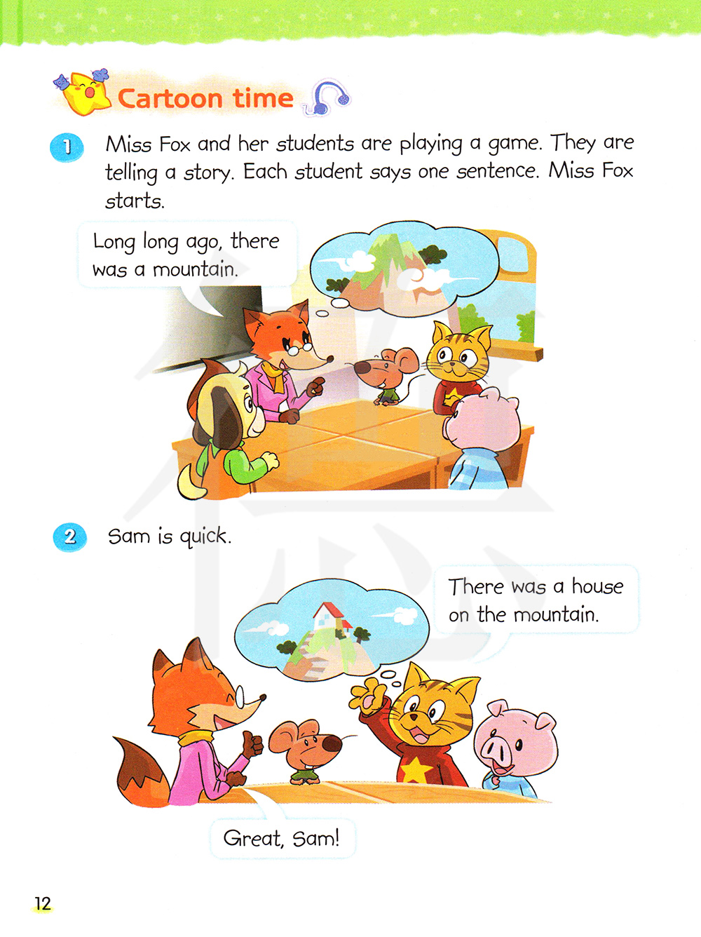 狐狸小姐和她的学生们在玩游戏。他们在讲故事。每个学生说一个句子。狐狸小姐开始了。