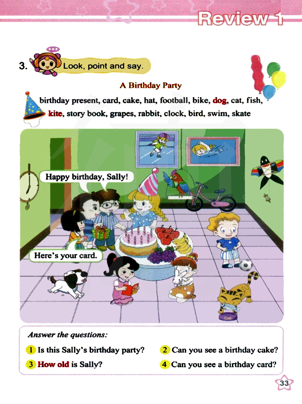 回答问题:1 这是萨利的生日宴会吗? 2 你能看到生日蛋糕吗? 3 萨利几岁了? 4 你能看到生日卡片吗?