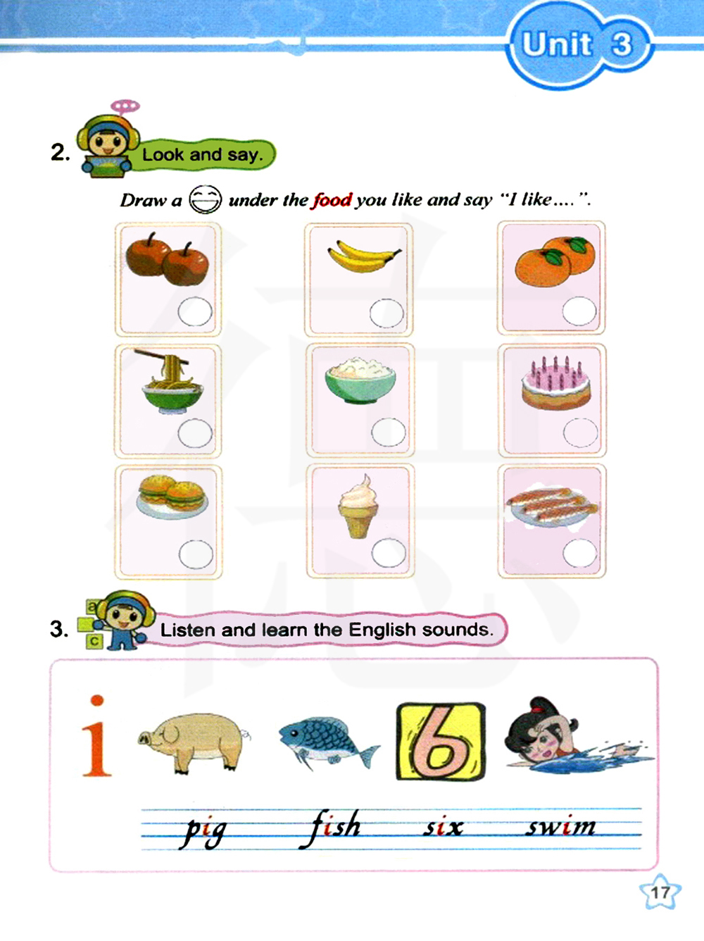 在你喜欢的食物下面画笑脸,并说“我喜欢……”。