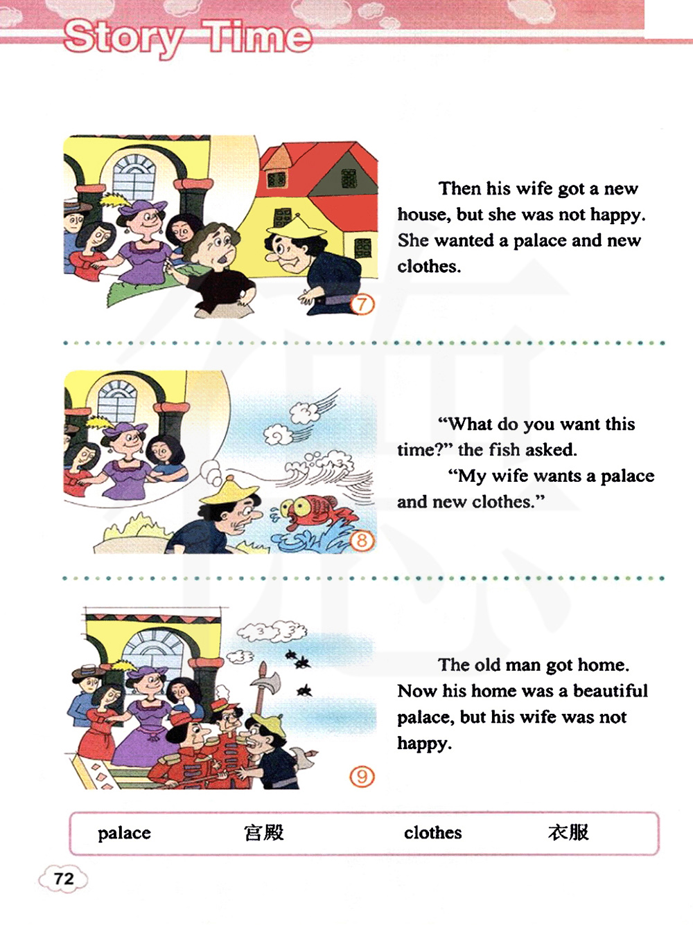 这次你想要什么呢?”金鱼问。 我的妻子想要一座宫殿和新衣服。
