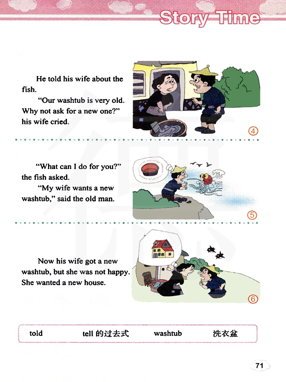 我可以为你做什么呢?”金鱼问道。我妻子想要一个新的洗衣盆,”老人说道。