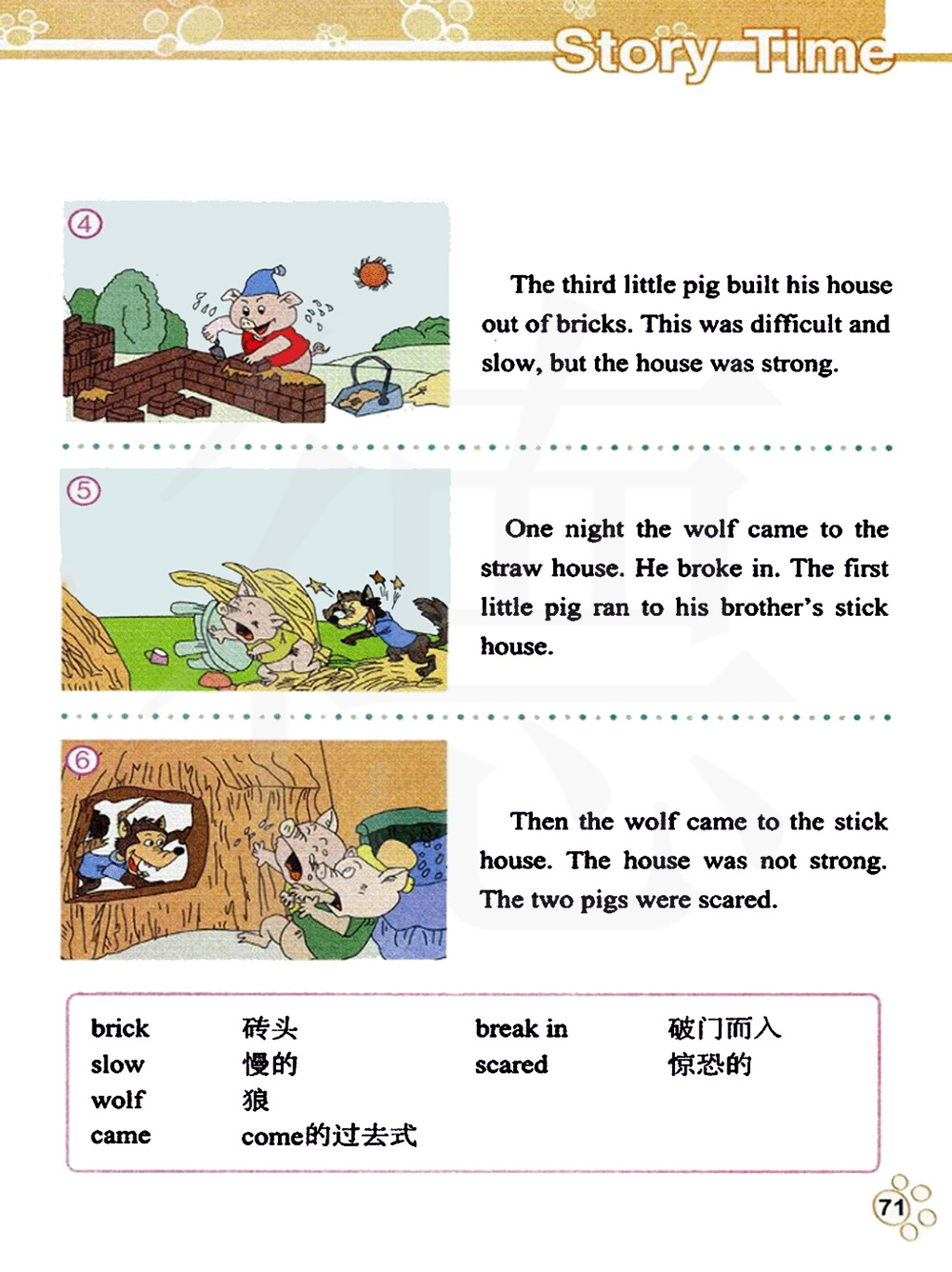 一天晚上一只狼来到稻草屋,它破门而入。第一只小猪跑到它兄弟的树枝房