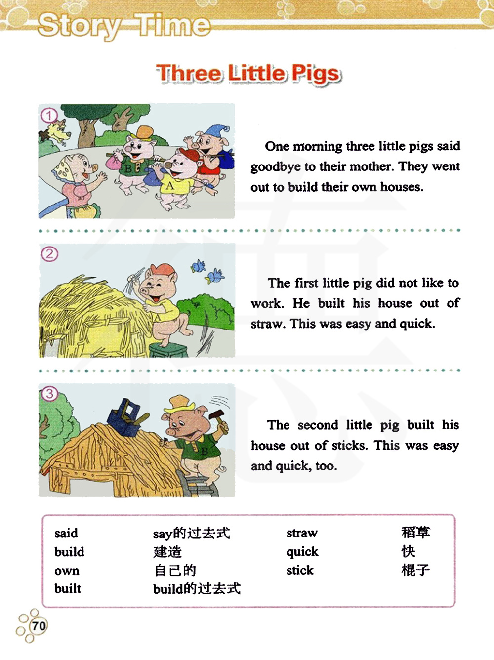第一只小猪不想工作。它用稻草建造它的房子。这既容易又快速