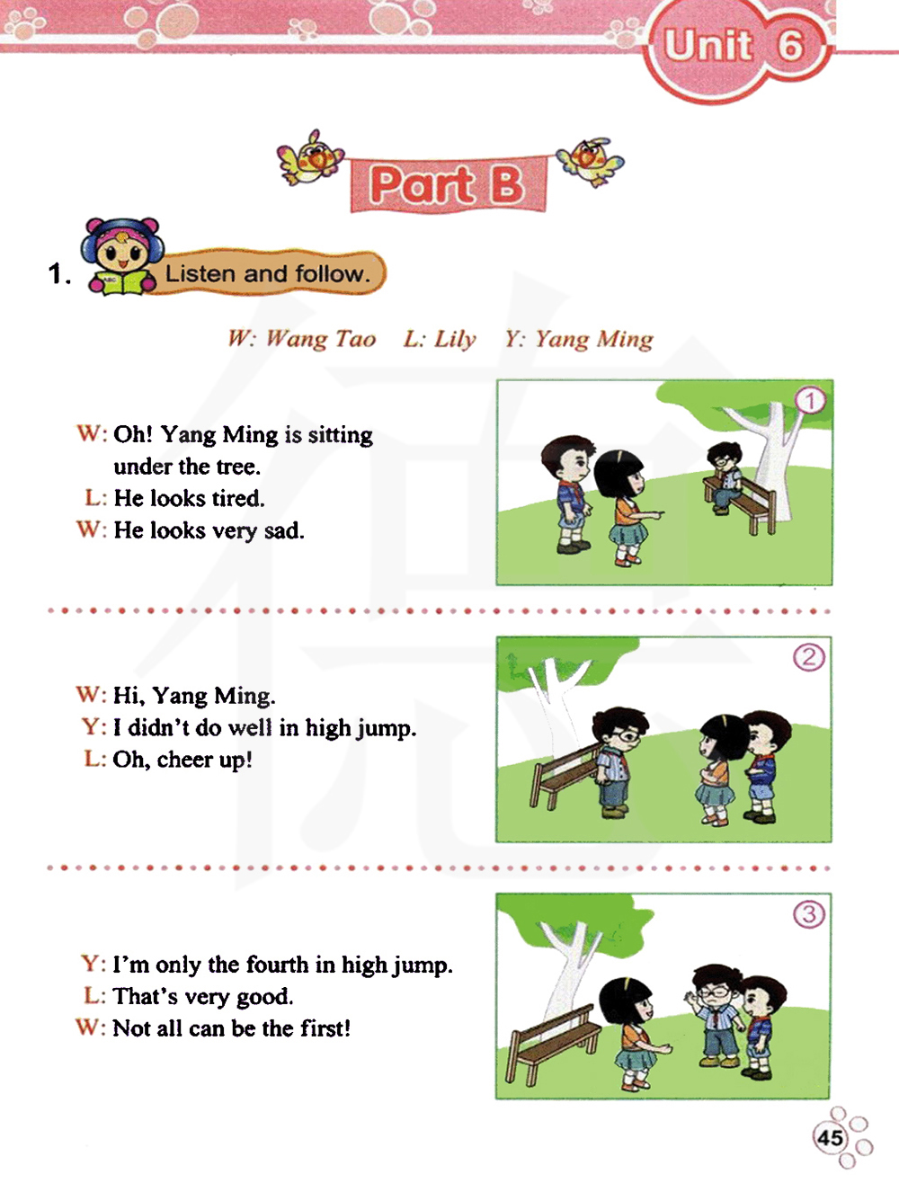 你好,杨明 。我跳高没跳好。噢!振作起来