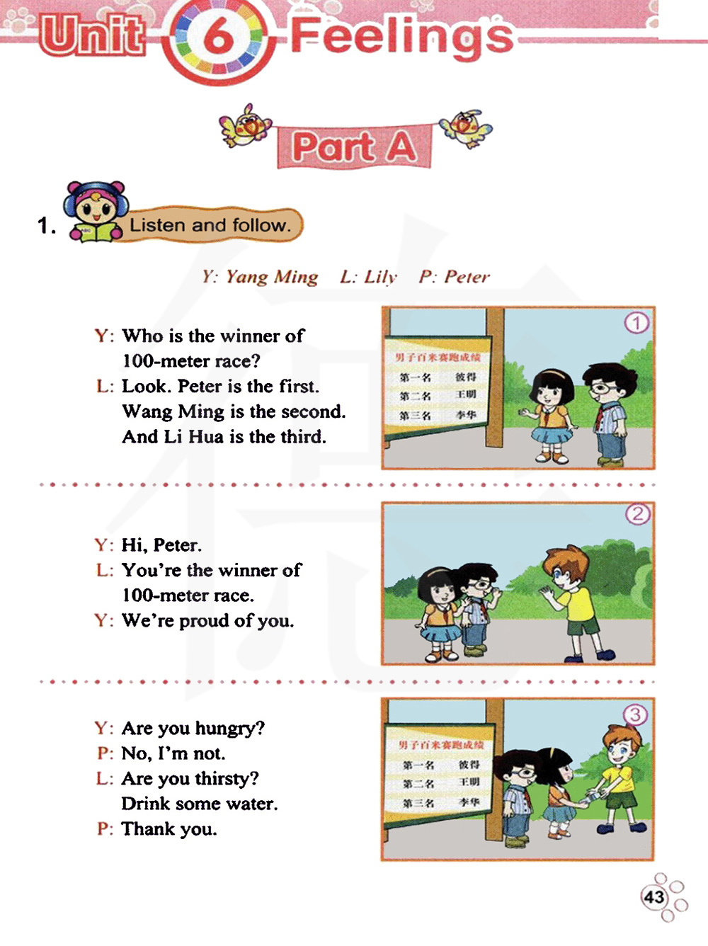 谁赢了百米赛跑?看,彼得是第一名。王明是第二名。李华是第三名