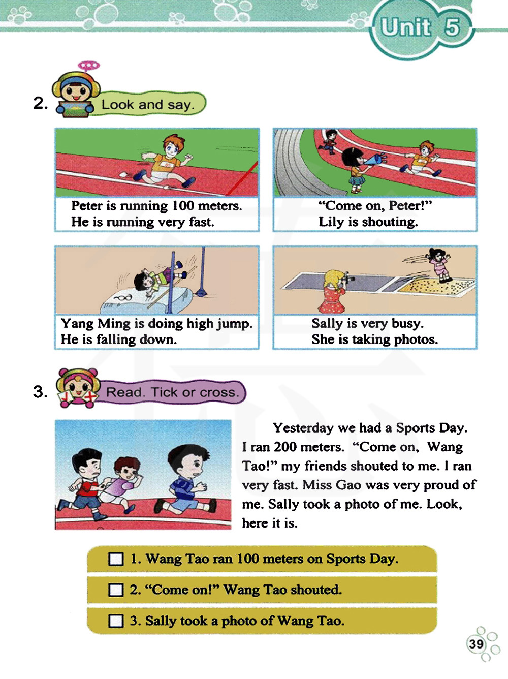 1.王涛运动会跑了100米。2.加油!王涛在大喊。3.莎莉给王涛照相了。