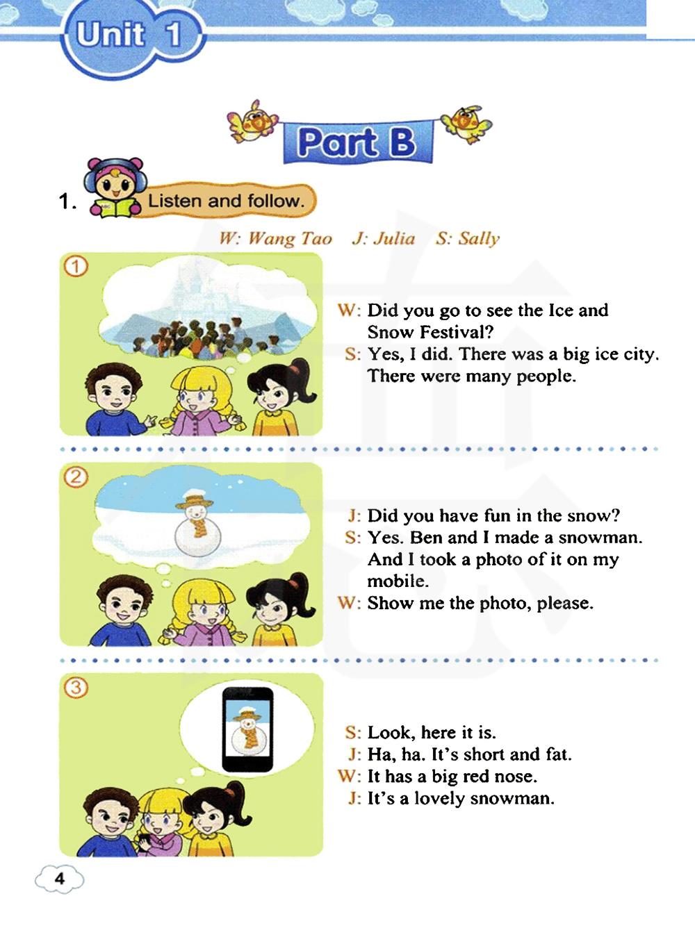 你在雪中玩的开心吗?开心。我和本堆了一个雪人。 而且我用手机给雪人拍了一张照片。请给我看看那张照片。