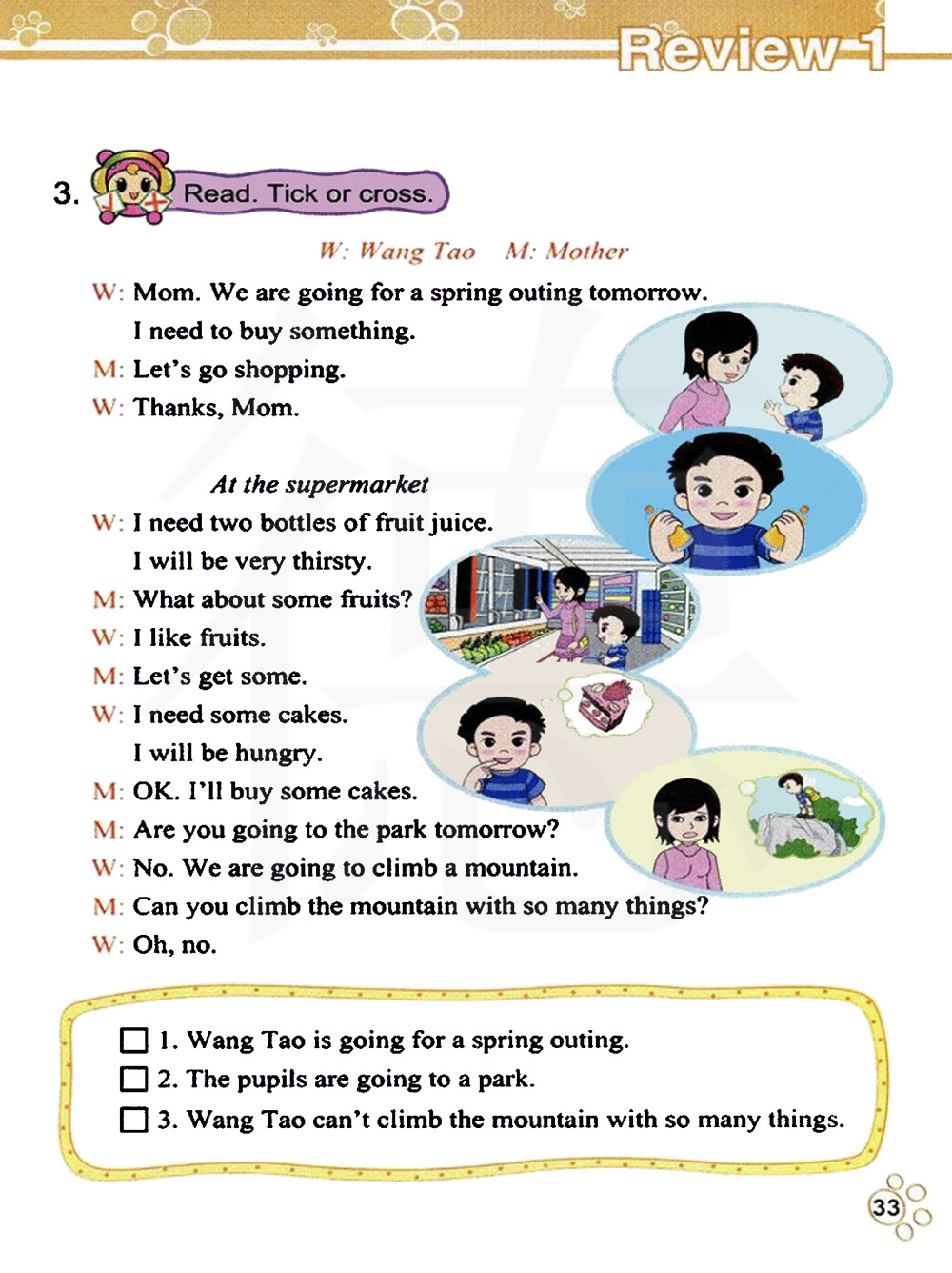 妈妈。我们打算明天去春游。我需要买一些东西。我们去购物吧。谢谢,妈妈