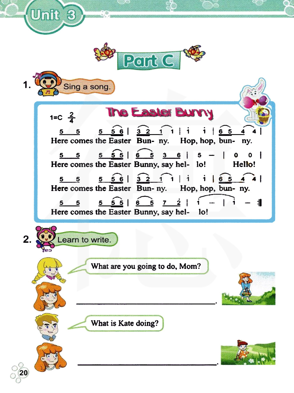 复活节小兔子 。复活节小兔子来了。蹦蹦跳跳,蹦蹦跳跳,小兔子。复活节小兔子来了,问声好!问声好!复活节小兔子来了。蹦蹦跳跳,蹦蹦跳跳,小兔子。复活节小兔子来了,问声好!