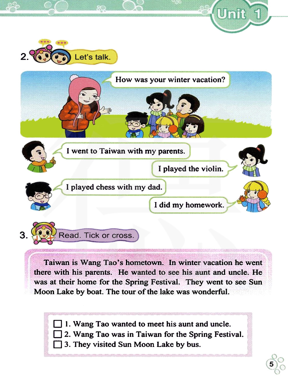 台湾是王涛的故乡。寒假里,他和父母一起去了台湾。 他想去看望他的叔叔和婶婶。他在他们家里过了春节。他们一起乘船游览了日月潭。 游湖真的很精彩。