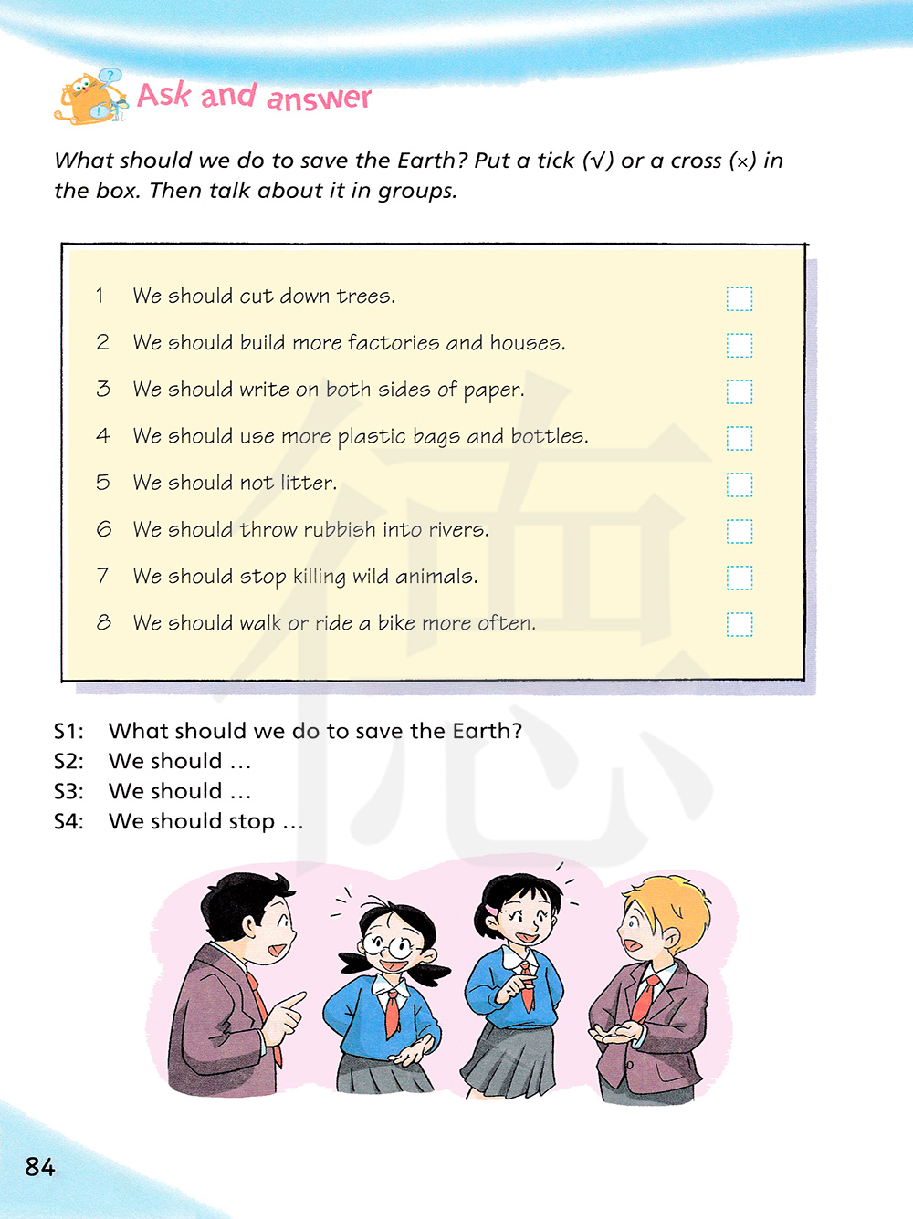 我们应该做些什么来拯救地球?在方框里打勾或画叉。然后分组讨论。
