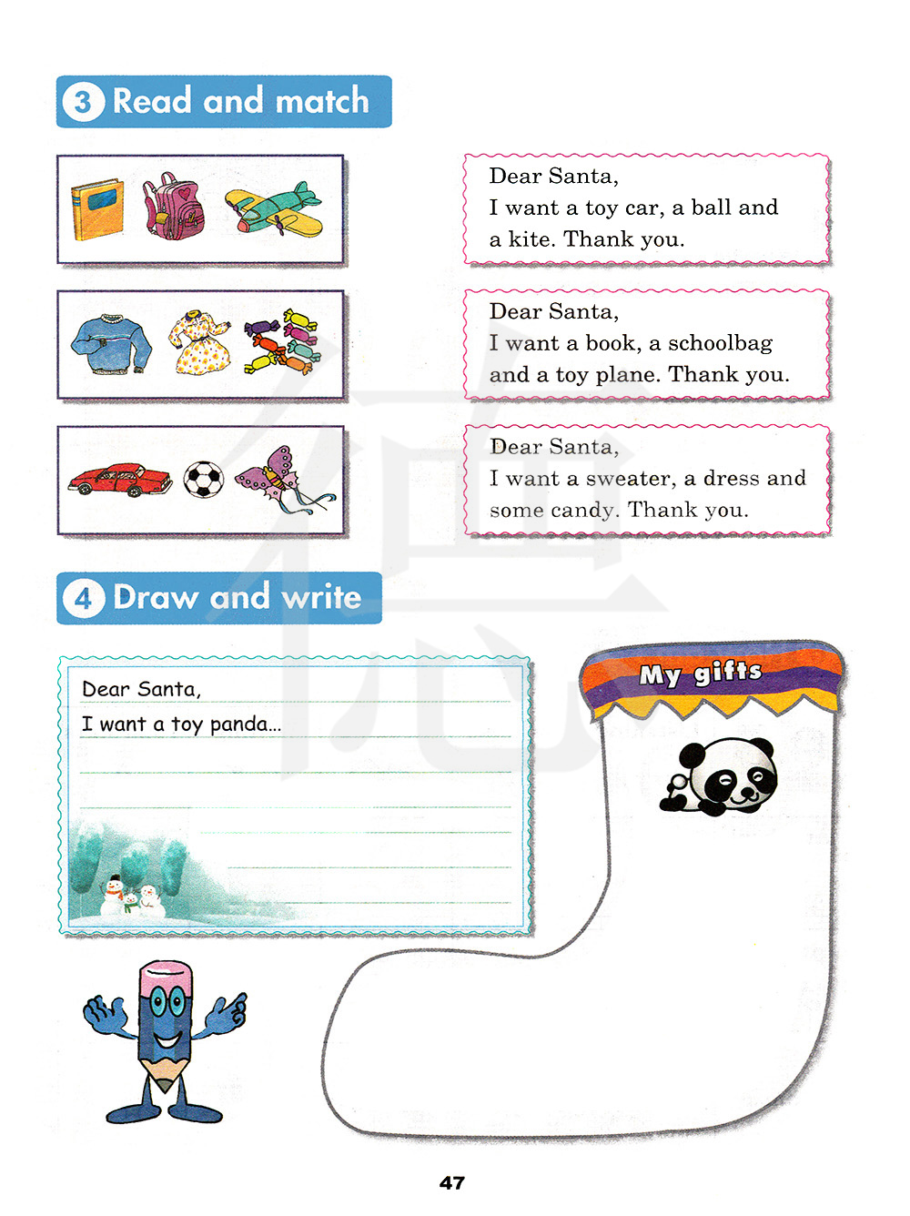 亲爱的圣诞老人:我想要一本书、一个书包和一个玩具飞机。谢谢你。