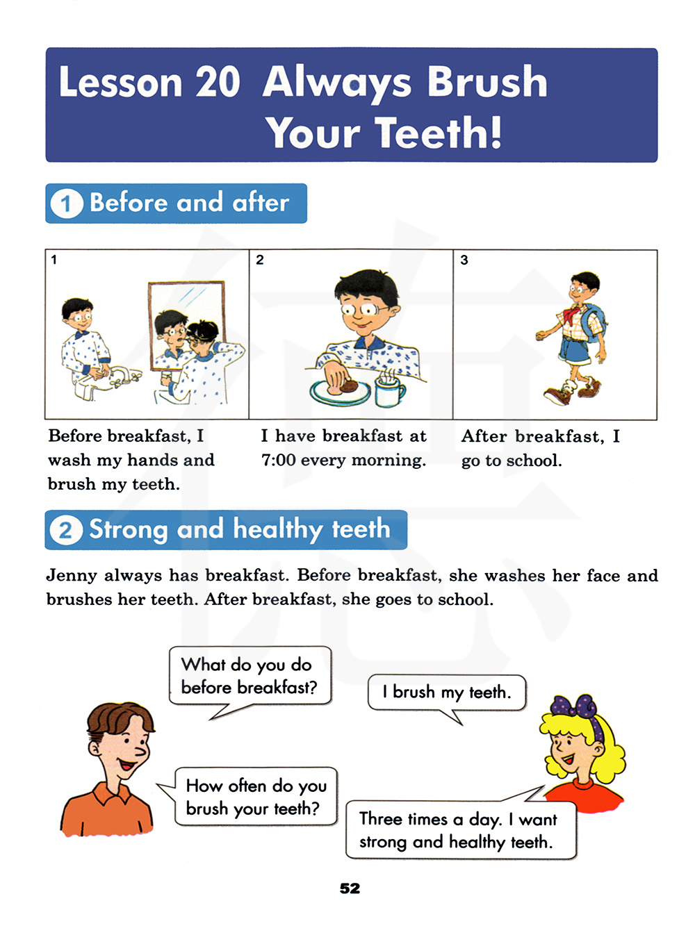 詹妮总是吃早餐。 早餐前,她洗脸、刷牙。 早餐后,她去上学
