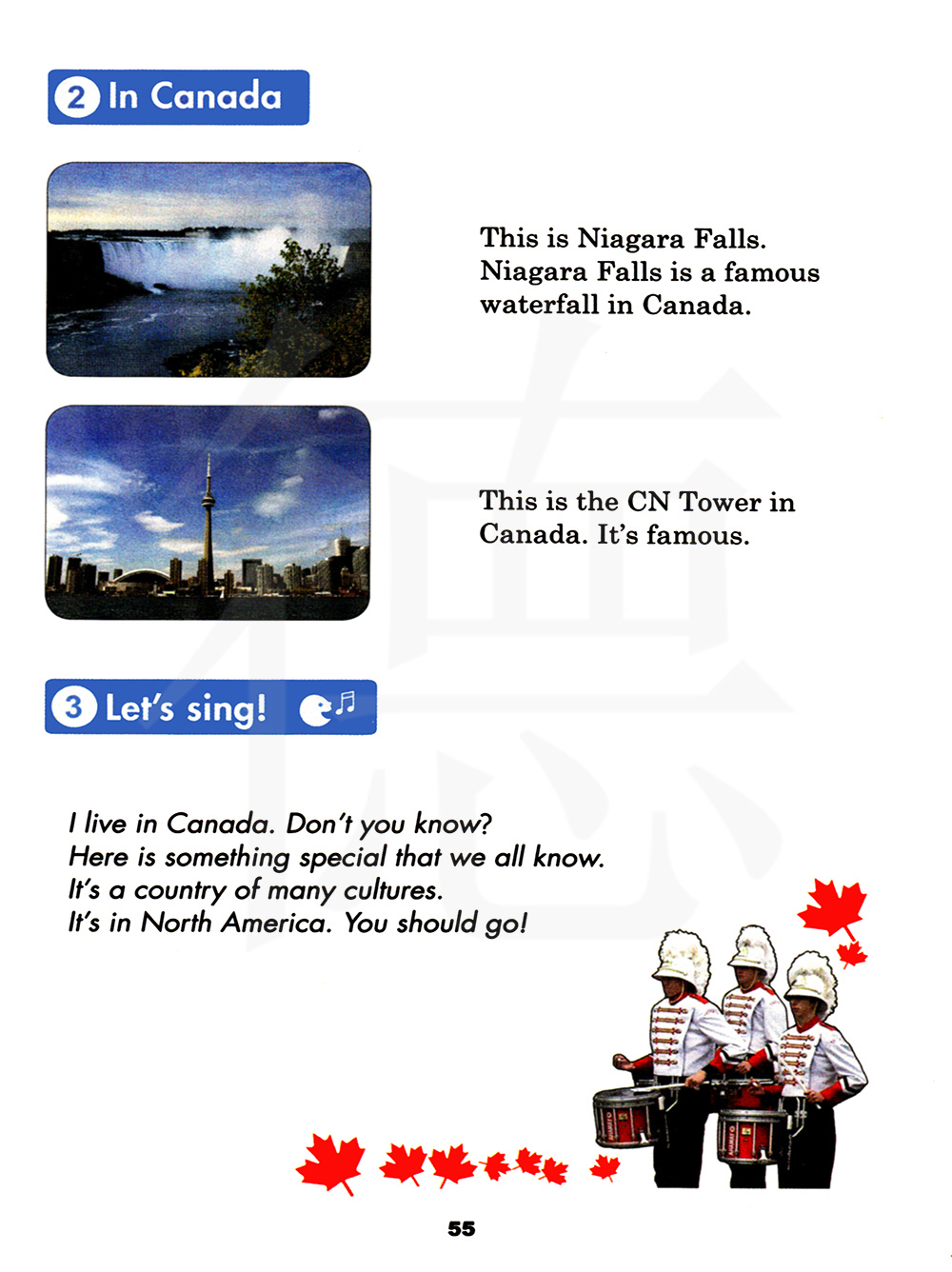 我住在加拿大,你知道吗?这里有一些我们都知道的特别的东西。 这是一个有着多种文化的国家。它在北美。你应该去(那里看看)!