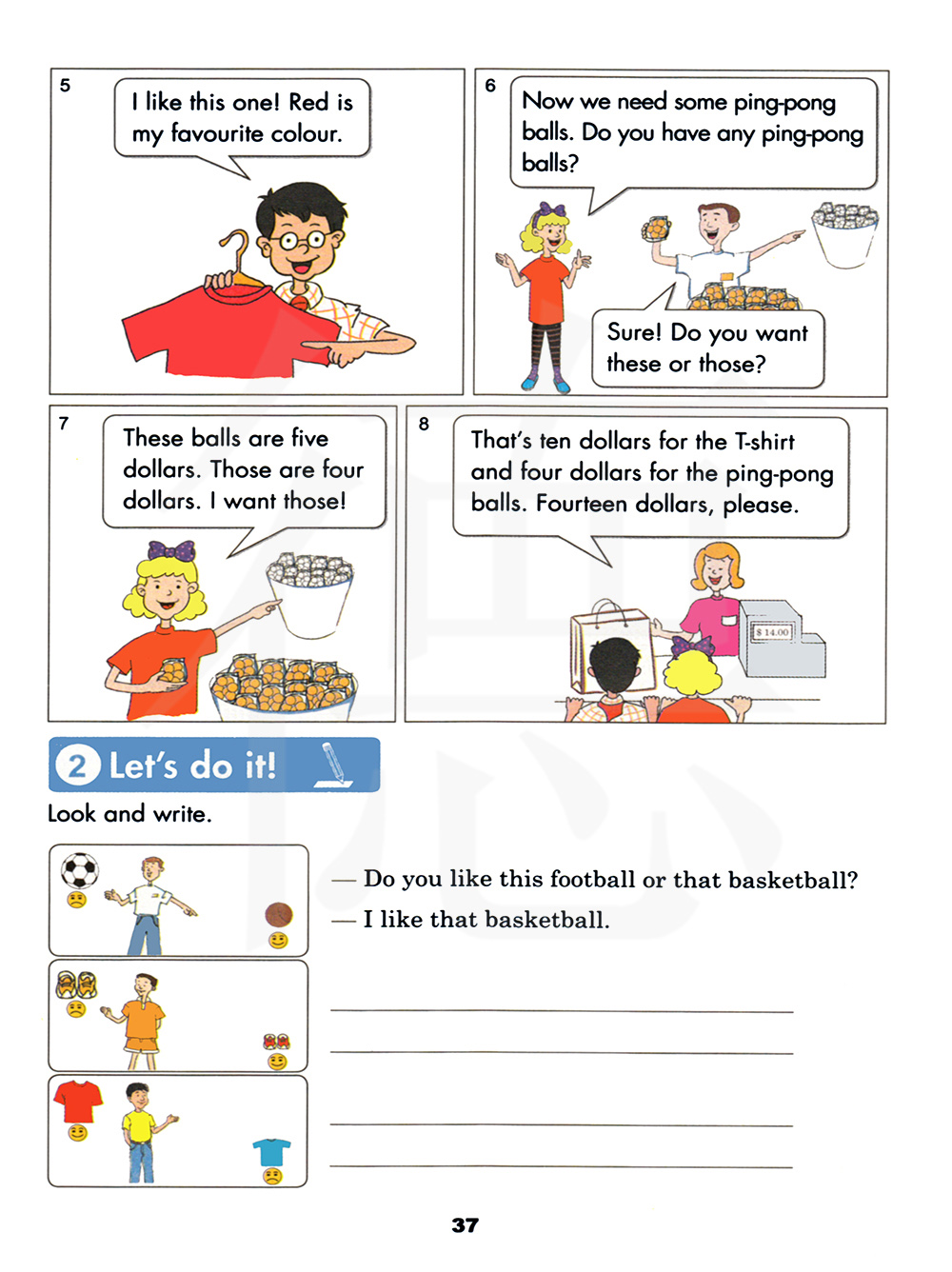 T恤衫是十美元,乒乓球是四美元。请给我十四美元。