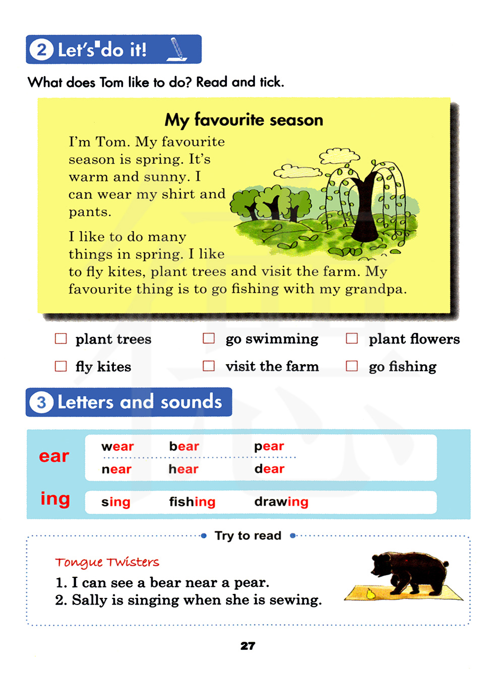 让我们来做一做吧! 汤姆喜欢做什么?读一读并勾一勾
