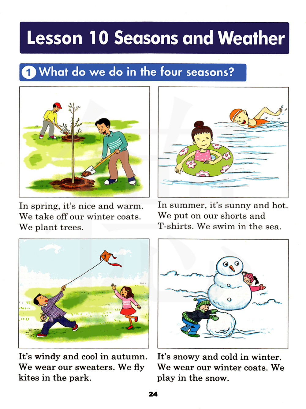 夏天里,阳光灿烂又炎热。我们穿上短裤和T恤衫。 我们在海里游泳。