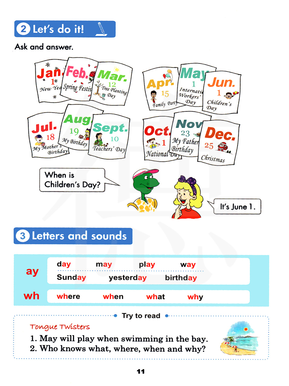 试着朗读 。绕口令。1. 梅想在海湾里游泳的时候玩儿。2. 谁知道什么、哪里、什么时候和为什么?