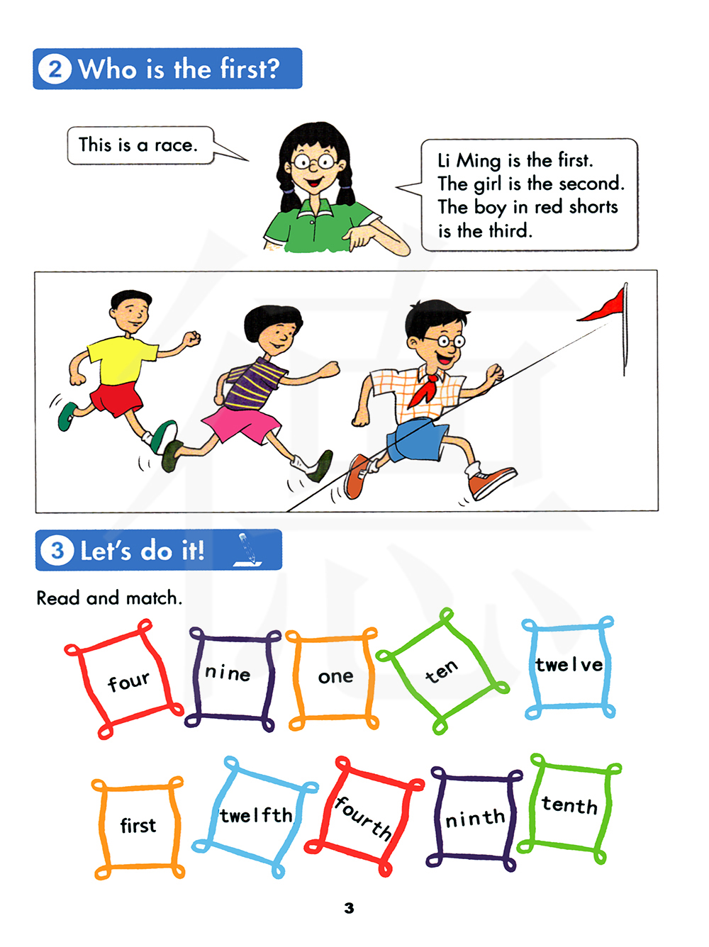 李明是第一名。 那个女孩儿是第二名。穿红色短裤的男孩儿是第三名。