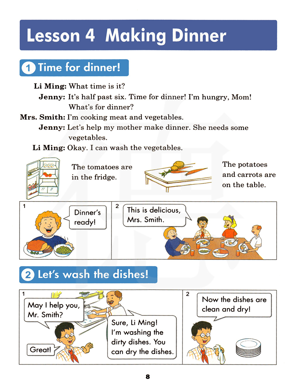我打算炒肉和蔬菜。让我们帮我妈妈做晚饭吧。 .她需要一些蔬菜。好的。我会洗菜。