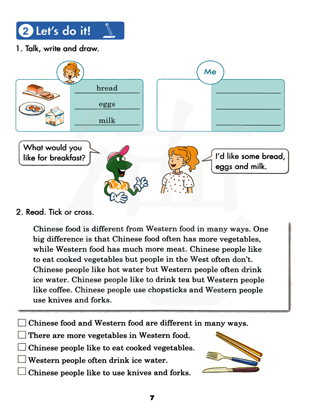 中国食物和西方食物在很多方面都不同。西方食物有更多蔬菜。中国人喜欢吃熟的蔬菜。西方人经常喝冰水。中国人喜欢用刀叉