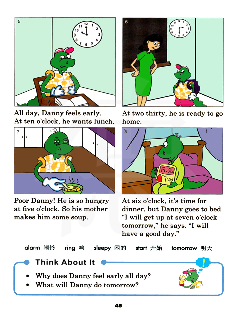 六点钟,该吃晚饭了, 但是丹尼上床睡觉。明天我要7点钟起床,他说。我将会有一个美好的一天。