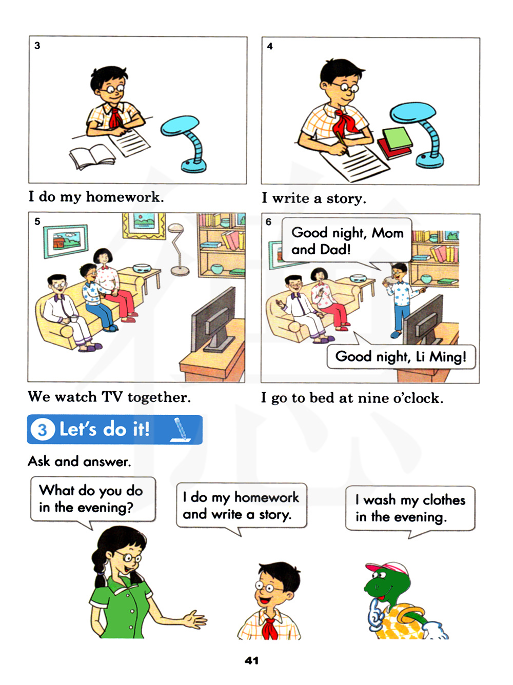我做家庭作业和写故事。