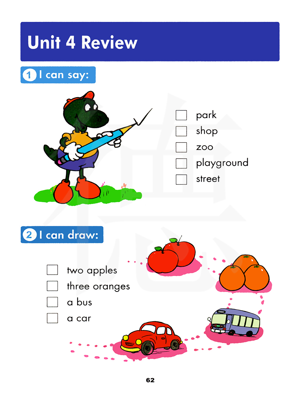 两颗苹果,三棵橘子,一辆公共汽车,一辆小汽车