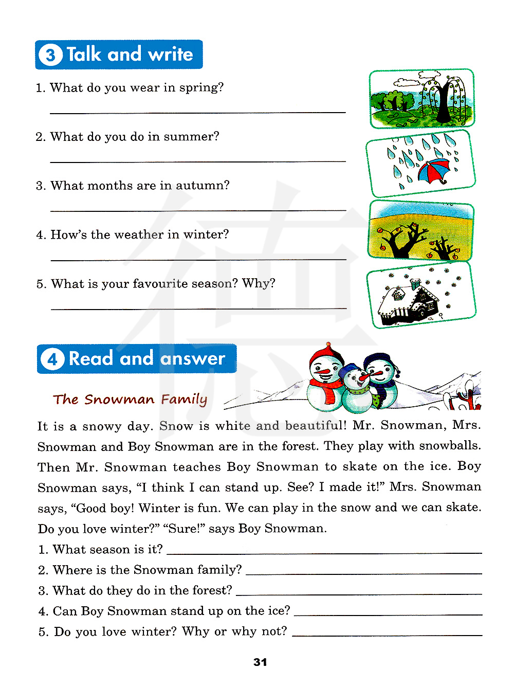 这是一个雪天。雪洁白而漂亮!雪人先生、雪人太太和雪人男孩在森林里。他们在玩雪球。然后雪人先生教雪人男孩滑冰。雪人男孩说,“我想我可以站起来。看见了吗?我成功了!”雪人太太说,“好孩子!冬天很有趣。我们可以在雪里玩耍,我们可以滑冰。你喜欢冬天吗?”“当然喜欢!”雪人男孩说。