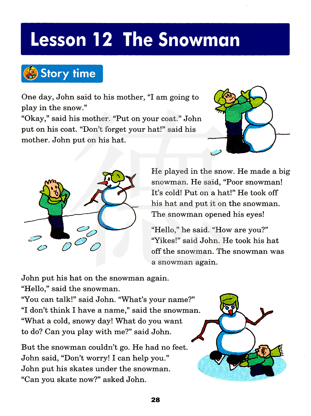 他在雪里玩。他做了一个很大的雪人。他说:“可怜的雪人!太冷了!戴上帽子!”他摘下他的帽子戴在雪人头上。雪人睁开了眼睛!