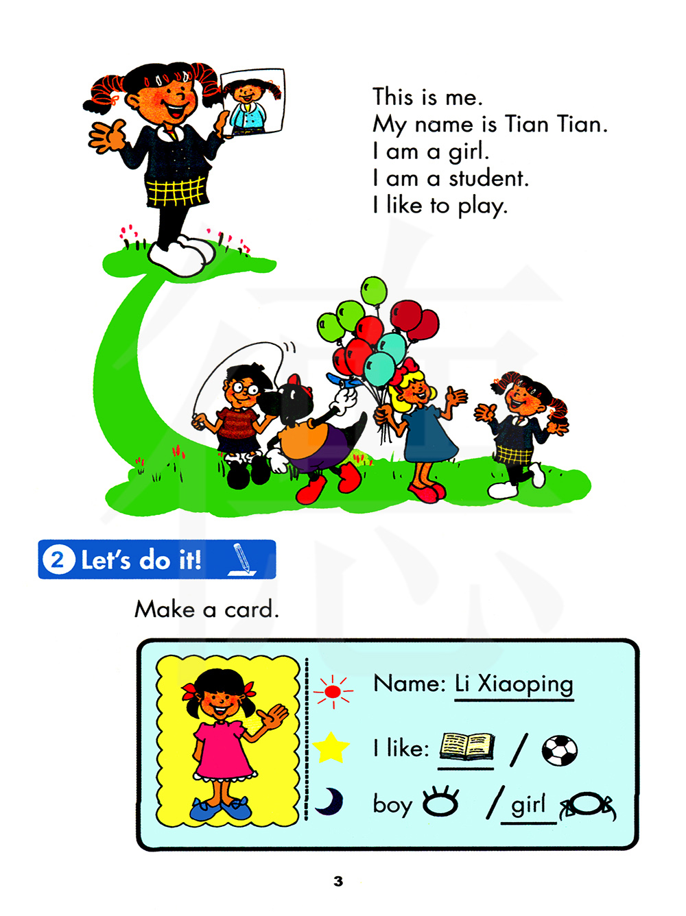 这是我。我叫甜甜。我是一个女孩。我是一名学生。我喜欢做游戏。