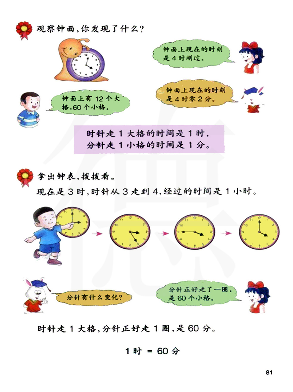 3、时针走1 大格是( 1 )小时; 分针走1 大格是( 5 )分钟,走1 小格是( 1 )分钟;秒针走1 大格是( 5 )秒钟,走1 小格是( 1 )秒钟。