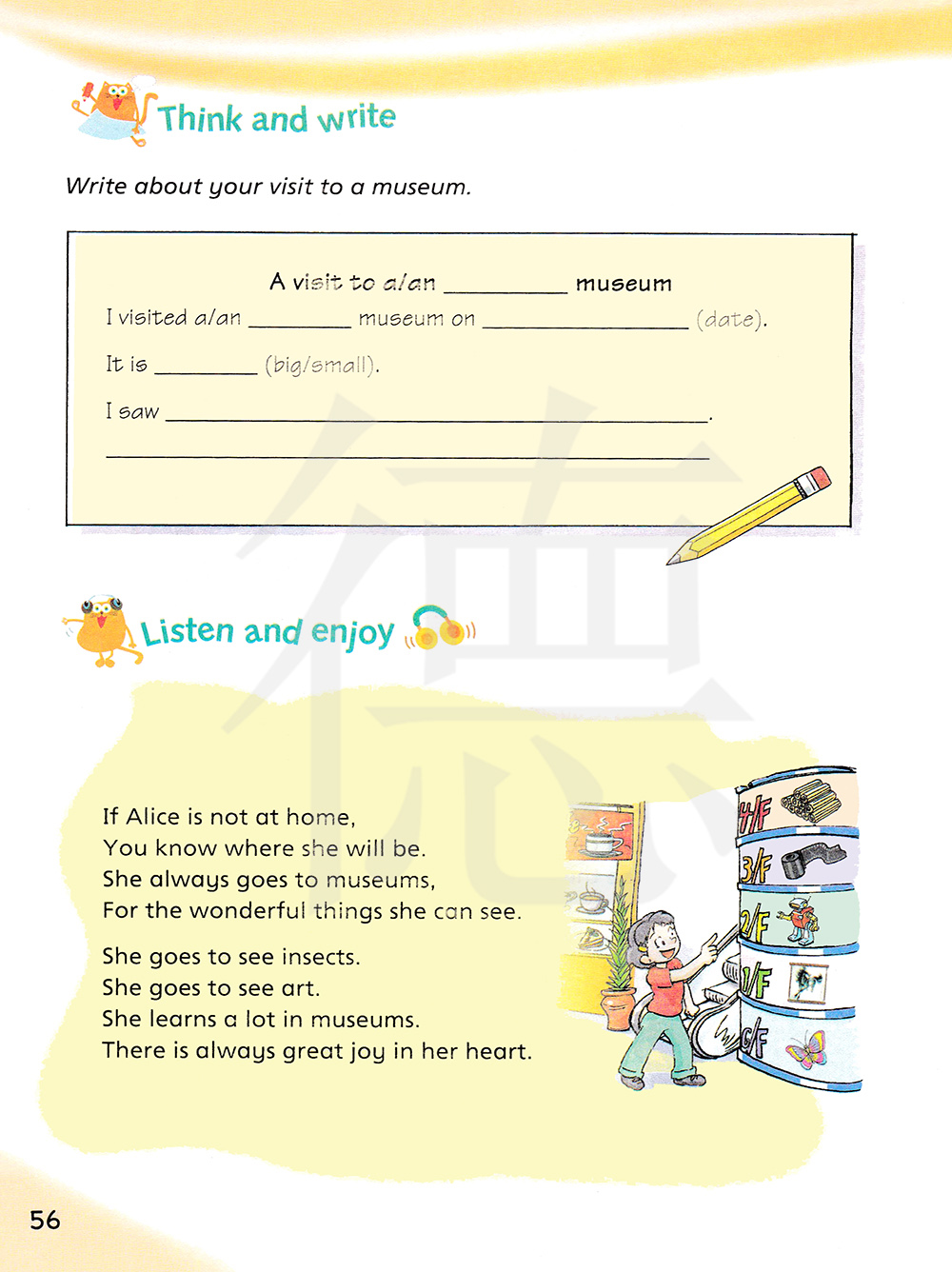 她去看昆虫。她去看艺术品。 她在博物馆学到了很多。在她的心里总是有巨大的乐趣。
