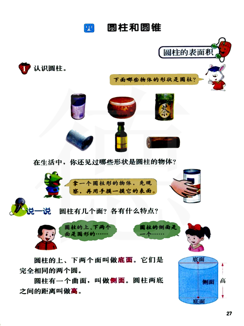 <div> 圆柱和圆锥</div> <div> 1 . 圆柱的特征:</div> <div> ( 1 )底面的特征: 圆柱的底面是完全相等的两个圆。</div> <div> ( 2 )侧面的特征: 圆柱的侧面是一个由面,其展开图是一个长方形。</div> <div> (3 )高的特征: 圆柱有无数条高。</div> <div> 2. 圆柱的高: 两个底面之间的距离叫做高。</div> <div> 3. 圆柱的侧面展开图: 当沿高展开时展开图是长方形;当底面周长和高相等时,</div> <div> 沿高展开图是正方形; 当不沿高展开时展开图是平行四边形。</div> <div> 4. 圆柱的侧面积: 圆柱的侧面积=底面的周长&times;高,用字母表示为: S 1&#39;!-~=Ch 。</div> <div> 5. 圆往的表面积: 圆柱的表面积=侧面积+2 &times;底面积,即S ~= S (J,1J+2 S /~o</div> <div> 6. 圆柱的体积: 圆柱所占空间的大小,叫做这个圆柱体的体积, V=Sh 。</div> <div> 7. 圆锥: 以直角三角形的一条直角边所在直线为旋转轴,其余两边旋转形成</div> <div> 的面所围成的旋转体叫做圆锥。该直角边叫圆锥的轴。</div> <div> 8. 圆锥的高:从圆锥的顶点到底面圆心的距离是圆锥的高。</div> <div> 9. 圆锥的特征:( 1 )底面的特征: 圆锥的底面一个圆。</div> <div> ( 2 )侧面的特征: 圆锥的侧面是一个曲面,展开图是扇形。</div> <div> (3 )高的特征: 圆锥只有一条高。</div> <div> 1 o. 圆锥的母线: 即圆锥的侧面展开形成的扇形的半径,底面圆周上点到顶点的</div> <div> 距离。圆锥有无数条母线。</div> <div> 11 . 圆锥的侧面: 将圆锥的侧面沿母线展开, 是一个扇形, 这个扇形的弧长</div> <div> 等于圆锥底面的周长,而扇形的半径等于圆锥的母线的长。</div> <div> 12. 圆锥的侧面积=底面的周长(展开图弧长) &times; 母线&divide; 2;</div> <div> 13. 圆锥的体积: 一个圆锥所占空间的大小,叫做这个圆锥的体积。</div> <div> 一个圆锥的体积等于与它等底等高的圆柱的体积的i 。根据圆柱体积公式<img alt="" src="/upload/images/1.jpg" style="width: 180px; height: 41px;" />&nbsp; &nbsp;得出圆锥体积公式: V=k Sh</div> <div> 14. 圆柱与圆锥的关系:</div> <div> ( 1 ) 与圆柱等底等高的圆锥体积是圆柱体积的二分之一。</div> <div> ( 2 )体积和高相等的圆锥与圆柱之间, 圆锥的底面积是圆柱的三倍。</div> <div> <div> ( 3 )体积和底面积相等的圆锥与圆柱之间, 圆锥的高是圆柱的三倍。</div> <div> 15. 生活中的圆锥:</div> <div> 生活中经常出现的圆锥有: 沙堆、漏斗、帽子。</div> </div> <p> &nbsp;</p>题库