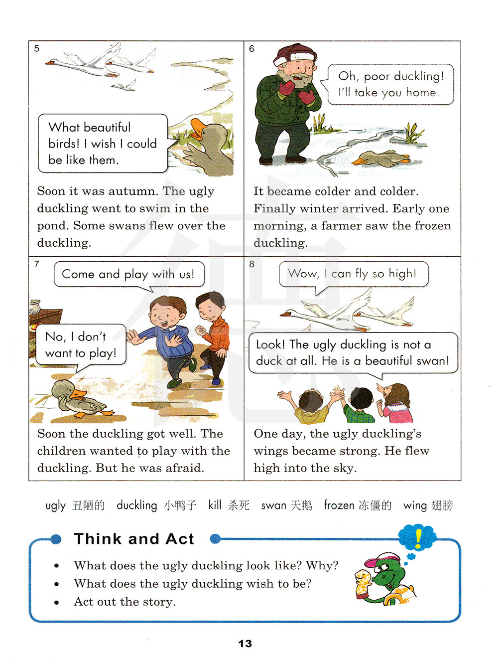 很快丑小鸭就恢复健康了。孩子们想和丑小鸭玩,但是他很害怕。