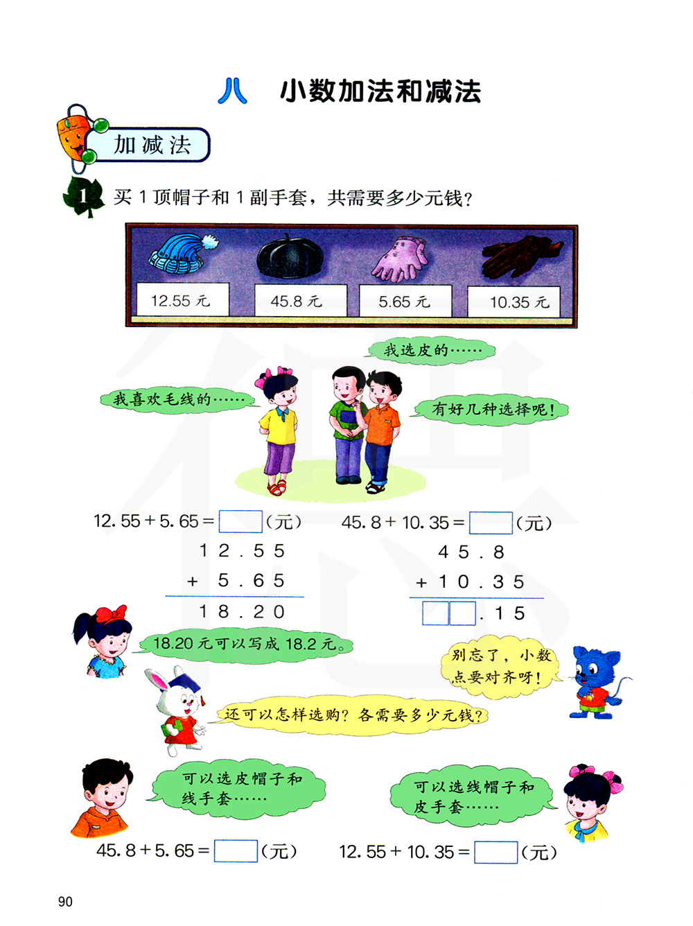 4、小数加减混合运算:小数加减混合运算的方法是一般有加有减按照从左到右的顺序进行运算,有括号的先运算括号里的。碰到能简算的要简算。
