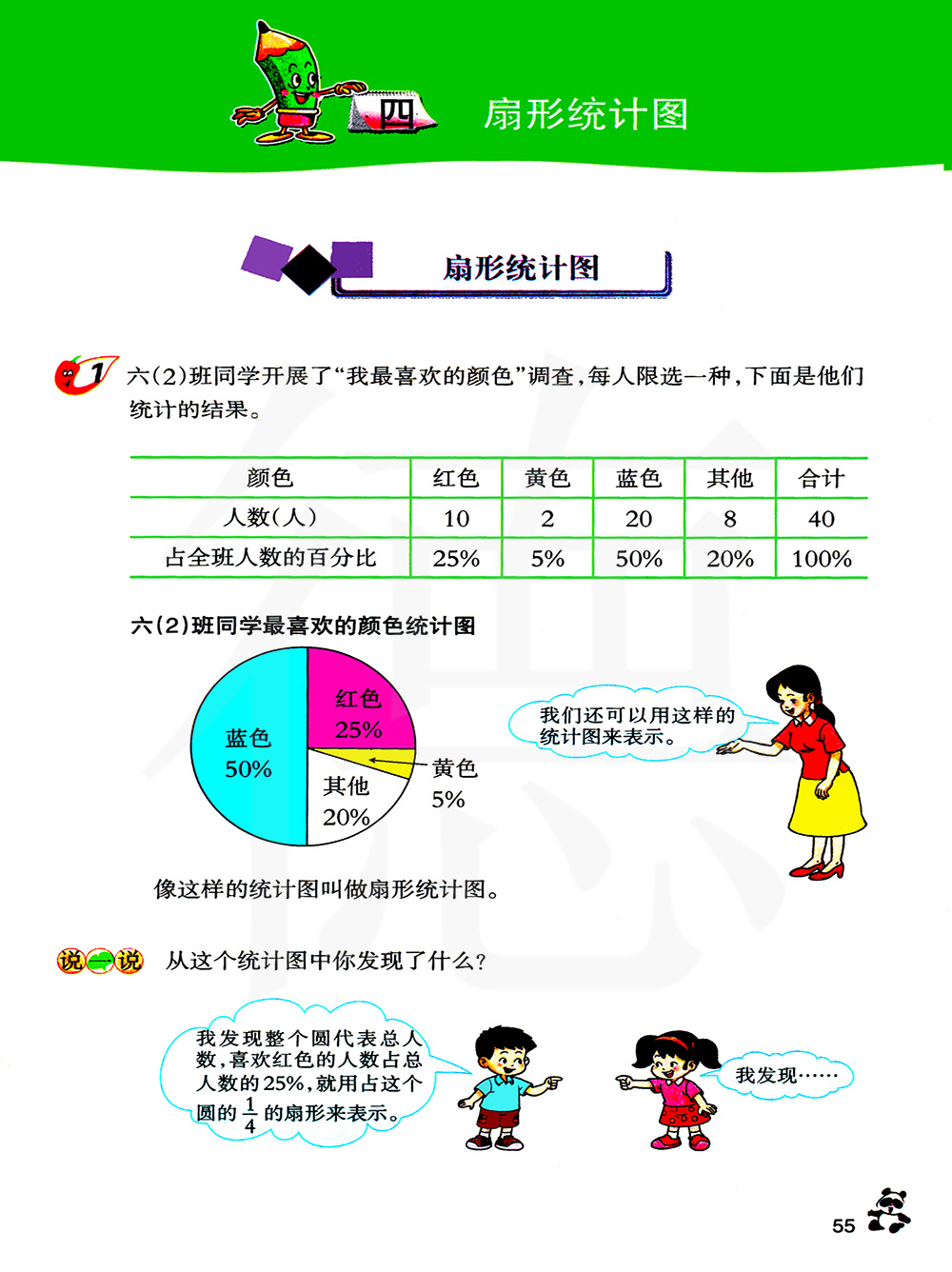 1、通过实例认识扇形统计图,了解扇形统计图的特点和作用。