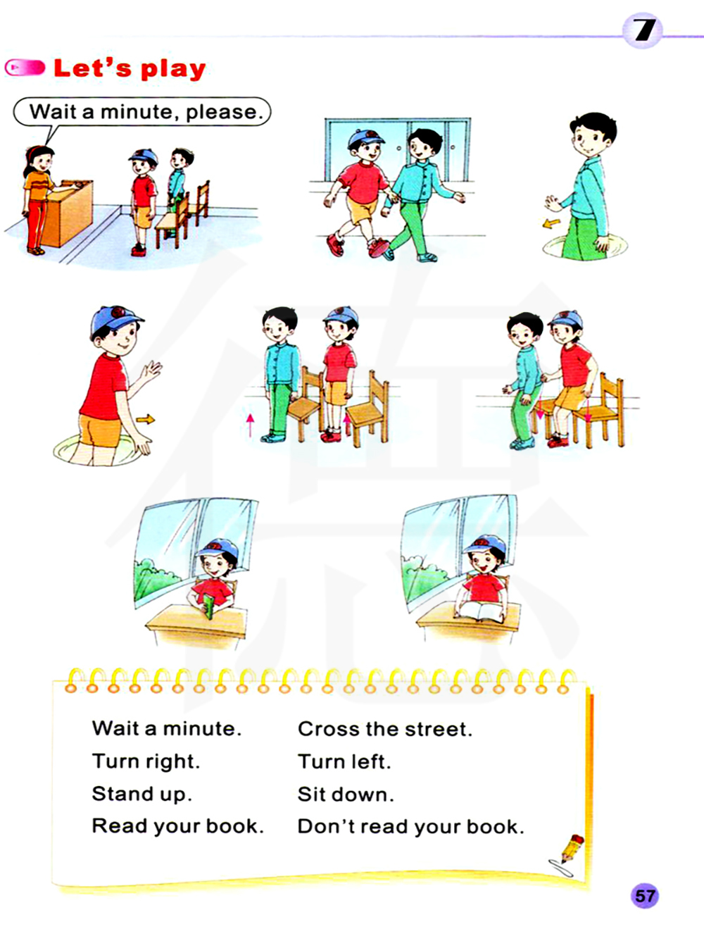 等一会。过马路。右转。左转。起立。坐下。阅读你的书本。不要阅读你的书本