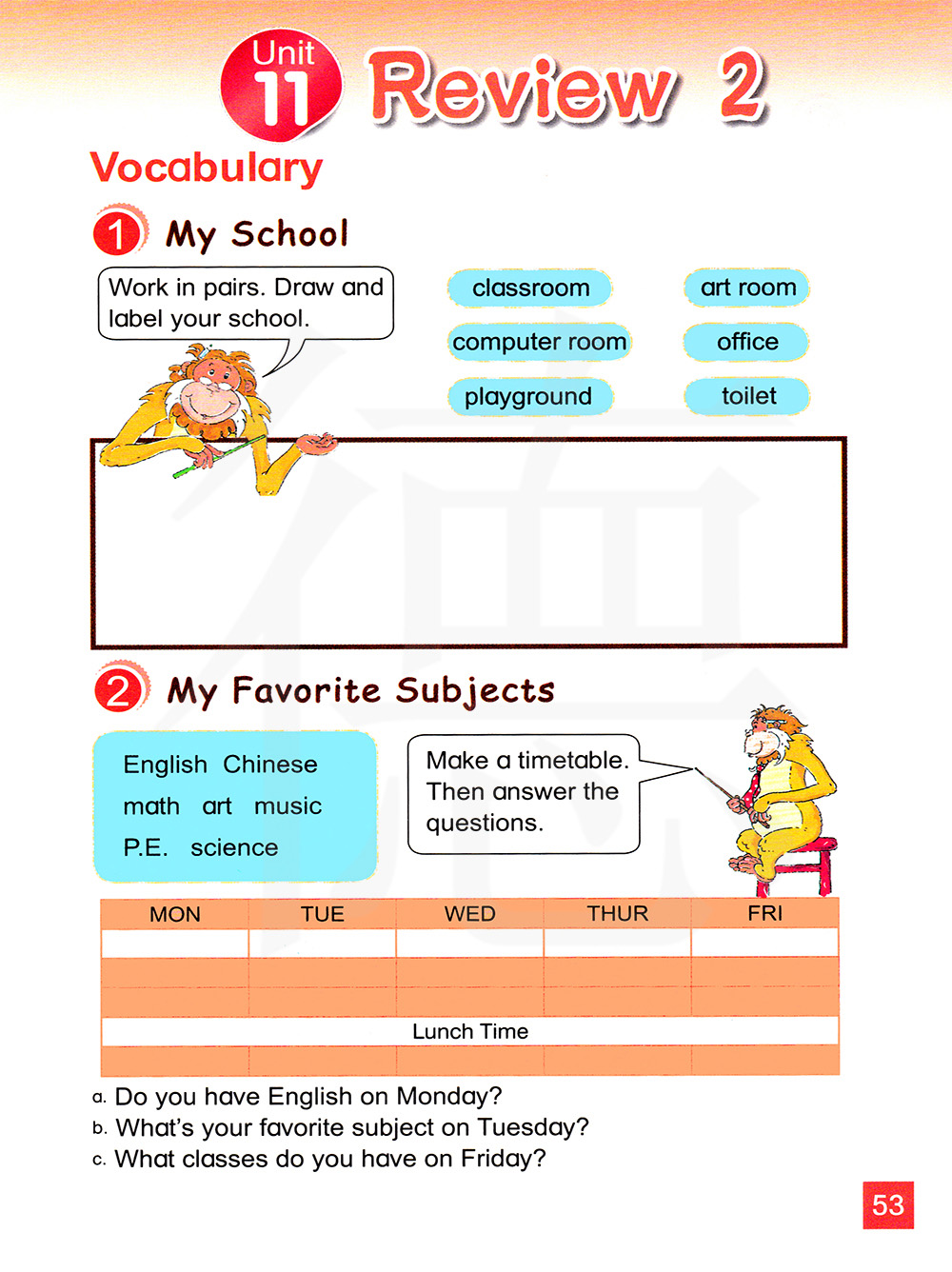 你星期一有英语课吗?星期二你最喜欢什么科目?你星期五要上什么课?