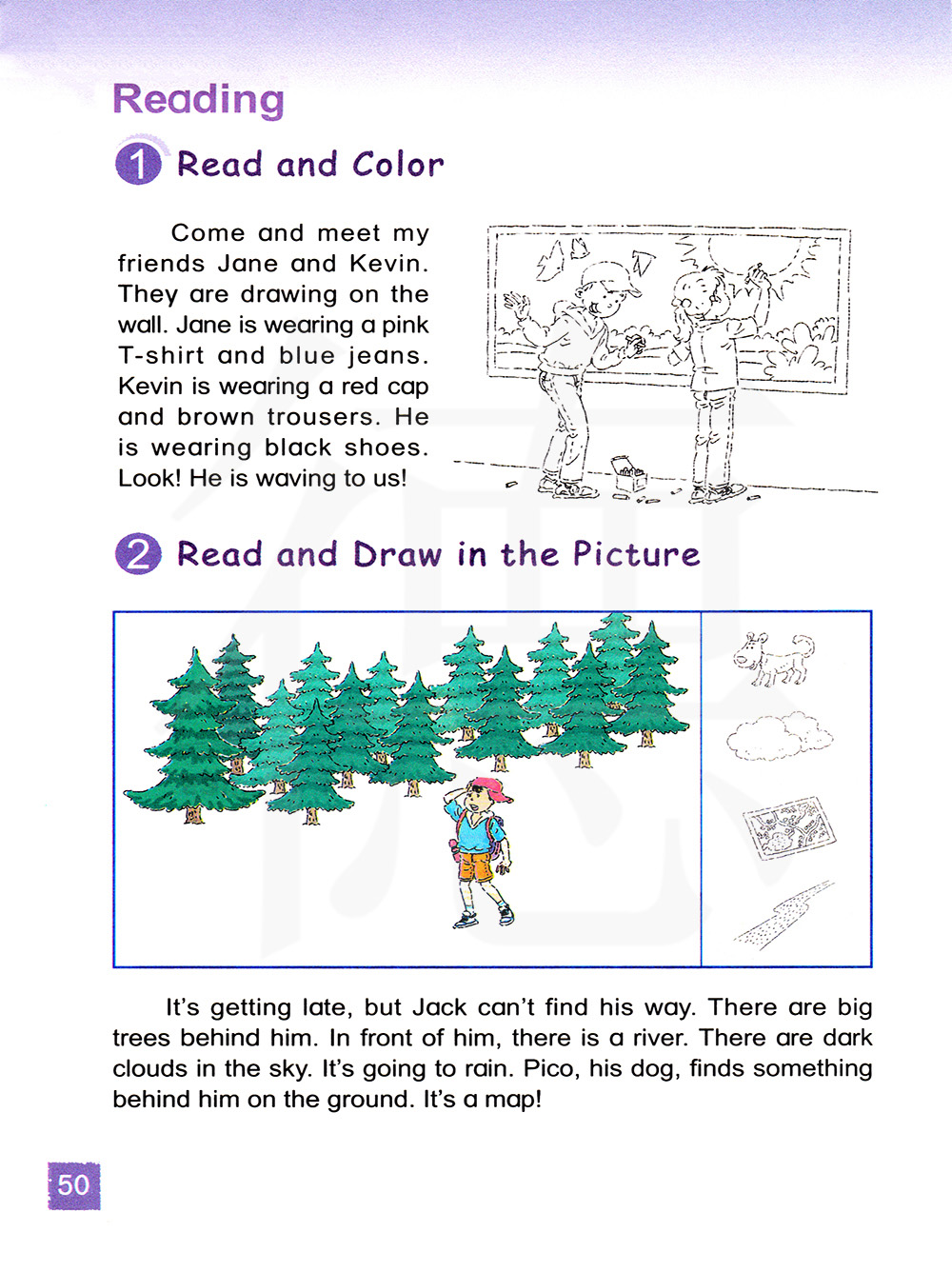 来认识一下我的朋友简和凯文。他们正在墙上画画。简穿着粉红色的T恤衫和蓝色的牛仔裤,凯文戴着红色的帽子,穿着棕色的长裤,他穿着黑色的鞋子。看!他在向我们招手!