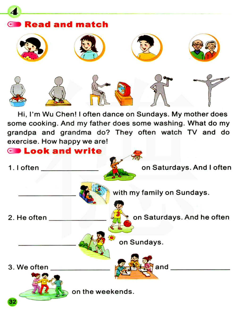 嗨,我是吴晨!我星期天经常跳舞,我母亲做饭,而我父亲洗衣服。我爷爷奶奶做什么?他们经常看电视和做运动,我们多么开心呀!