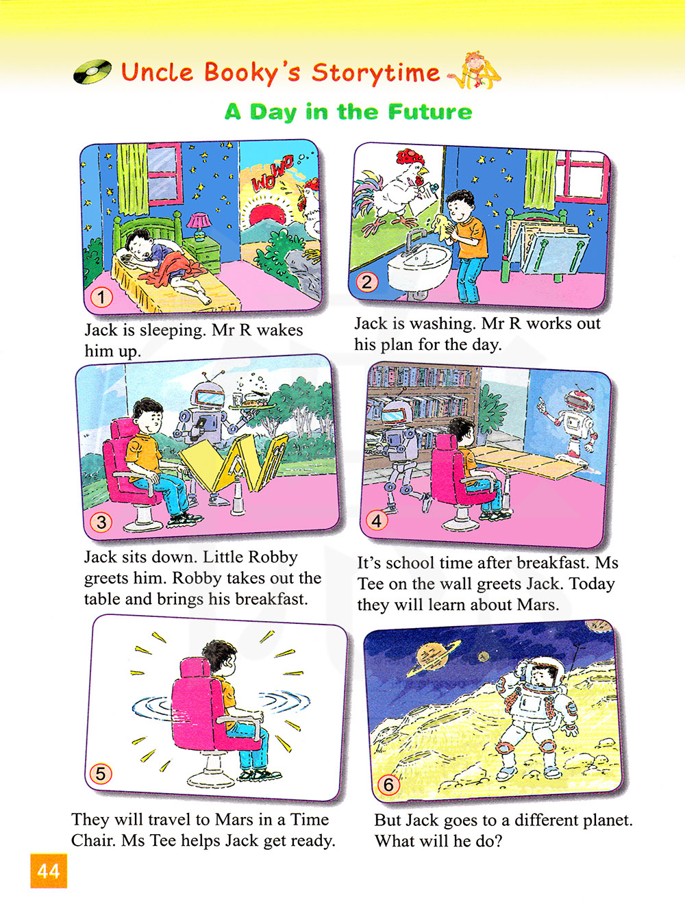 早餐过后是上学时间了。 墙上的Tee女士向杰克问好。今天他们将会学习有关火星的知识。
