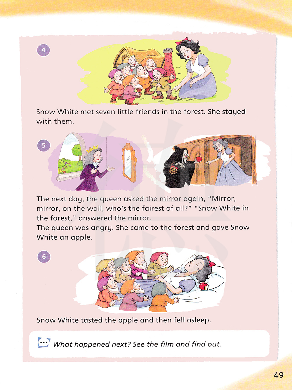 第二天,王后又问魔镜,“魔镜,魔镜,墙上的魔镜,谁是世界上最漂亮的人?”“森林里的白雪公主,”魔镜回答。