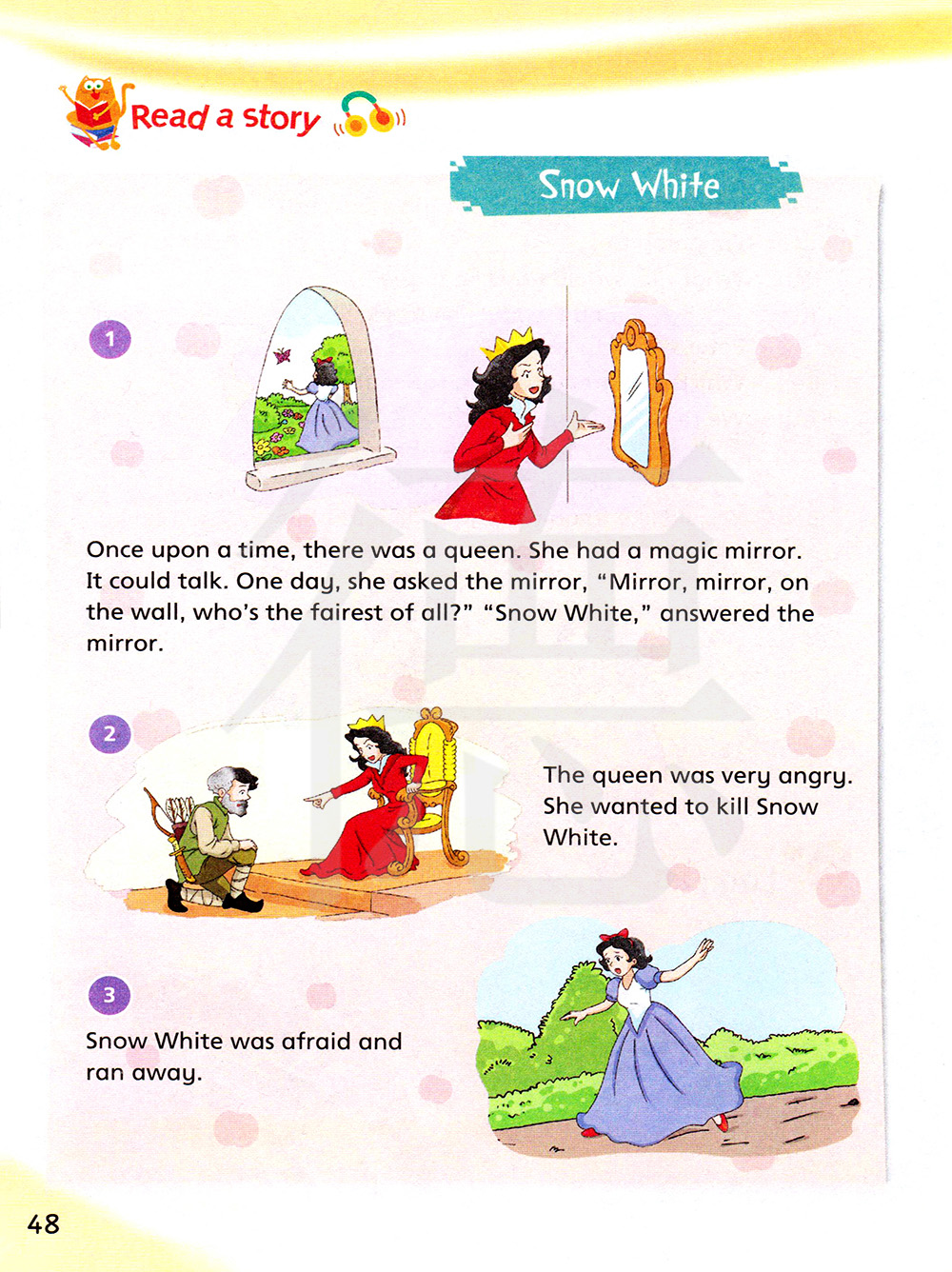 从前,有一个王后。她有一面魔镜。它可以说话。有一天,她问魔镜,“魔镜,魔镜,墙上的魔镜,谁是世界上最漂亮的人?” “白雪公主,”魔镜回答。
