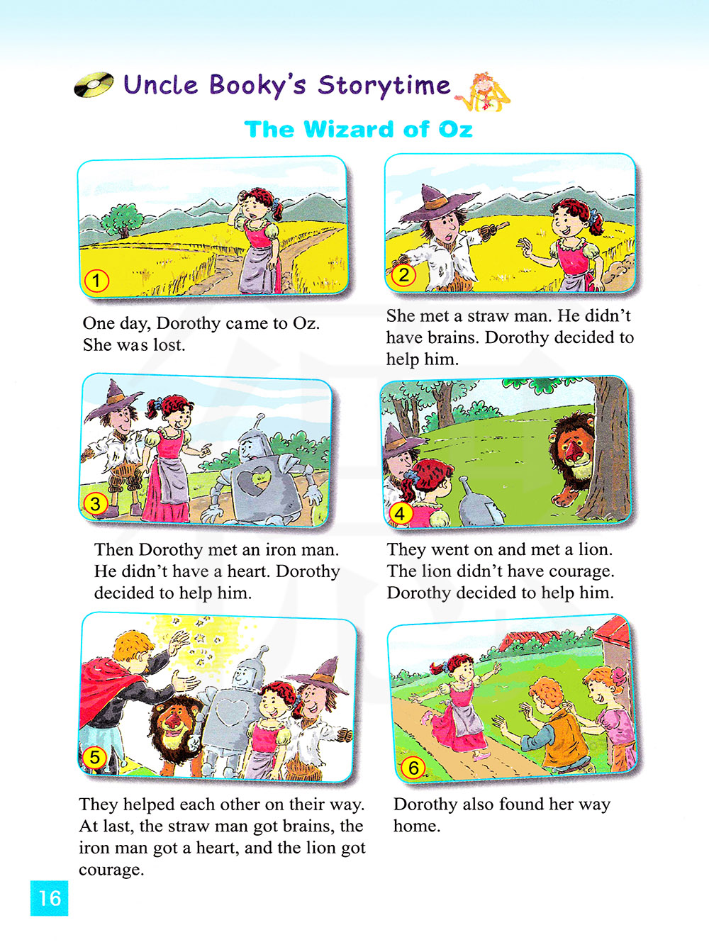他们在路上彼此帮助。最后,稻草人有了脑子,铁人有了心,狮子有了勇气。