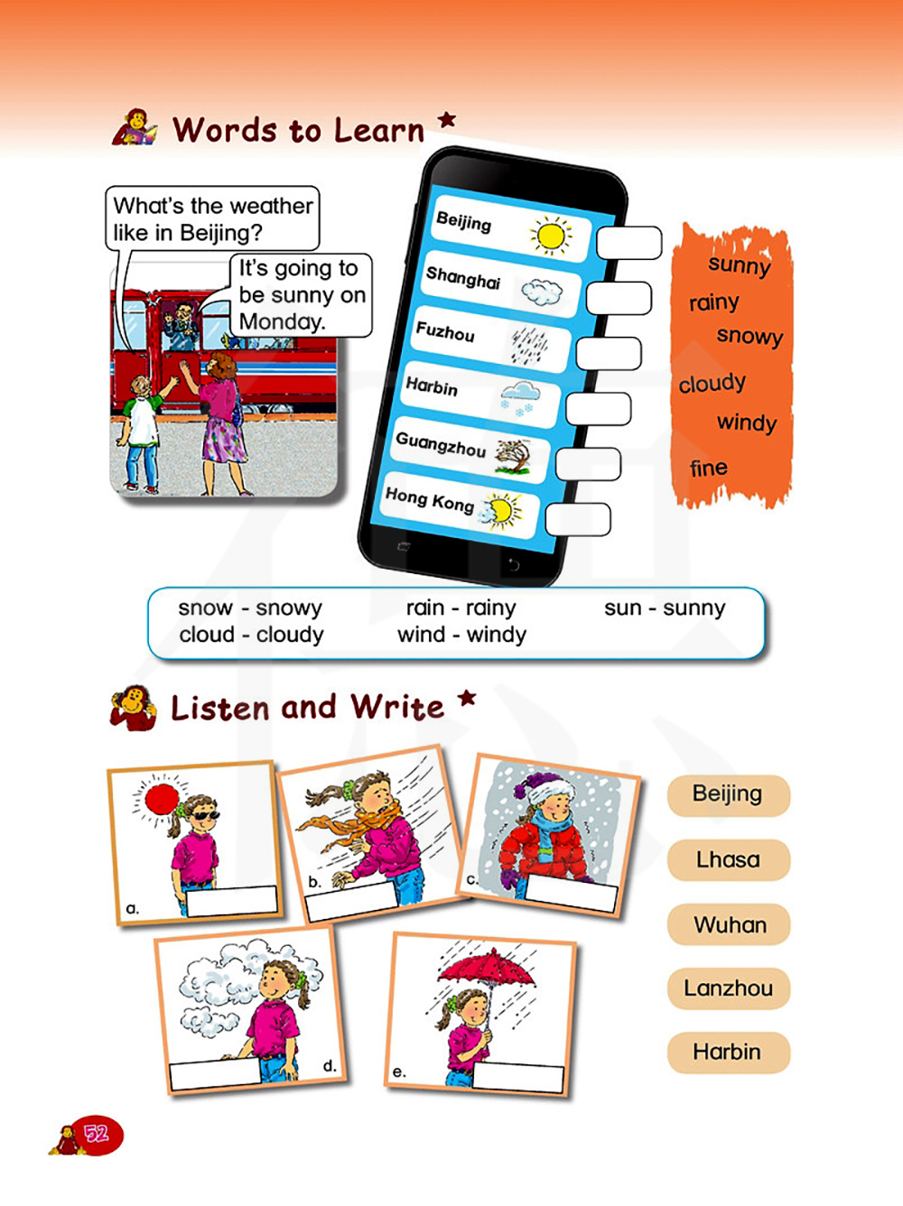 雪——多雪的 雨——阴雨的 太阳——阳光充足的 云——多云的 风——有风的