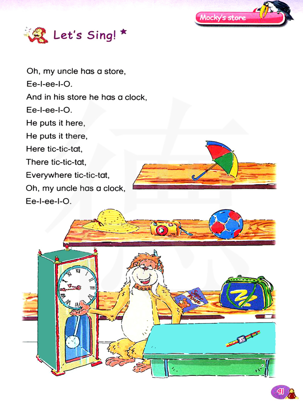 哦,我的叔叔有个商店,咿呀咿呀哟。在他的商店里有个闹钟,咿呀咿呀哟。他把它放在这里,他把它放在那里,这里滴滴答,那里滴滴答,到处滴滴答。哦,我的叔叔有个闹钟,咿呀咿呀哟。