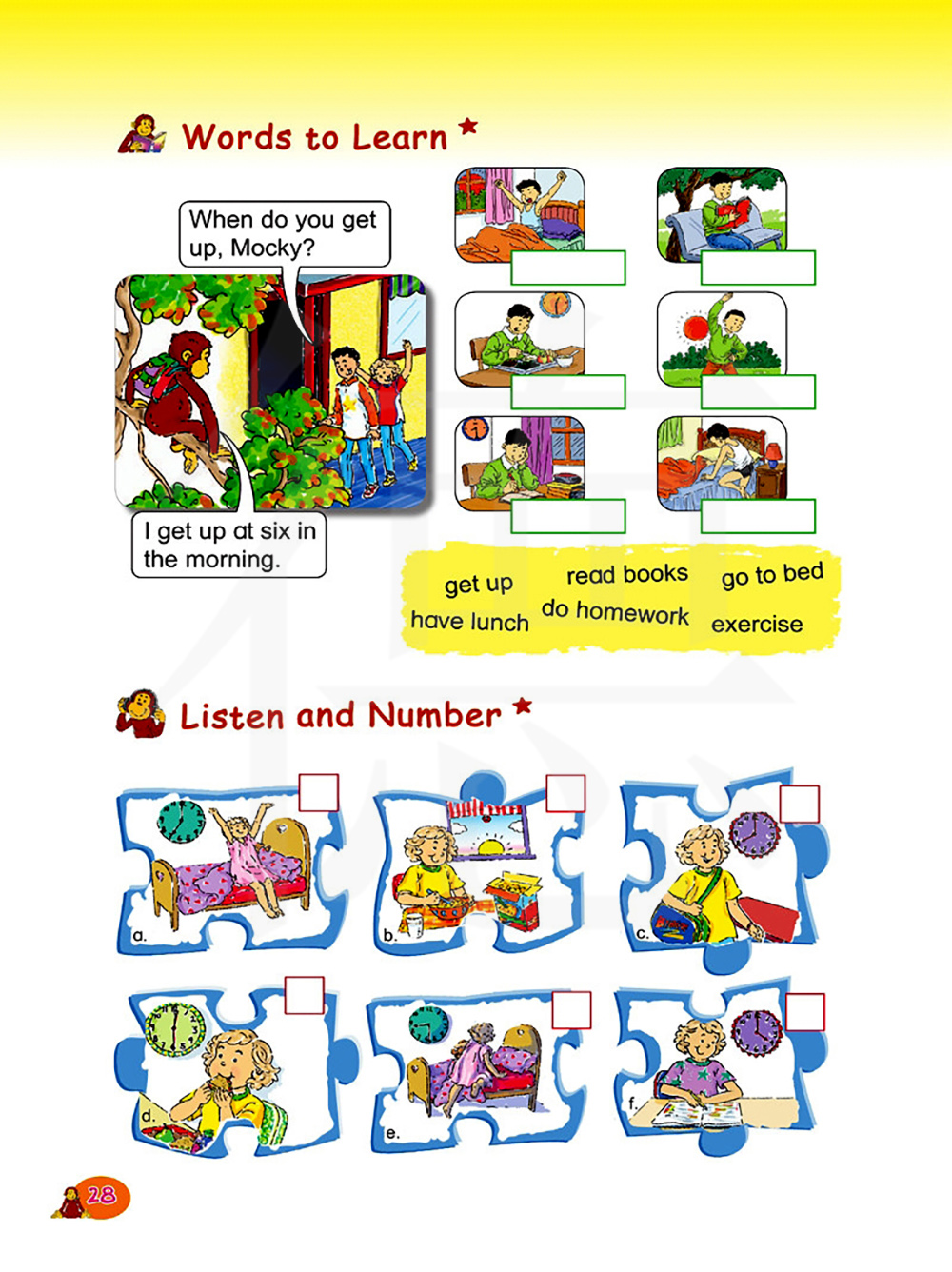 起床 看书 上床睡觉 吃午饭 做作业 锻炼