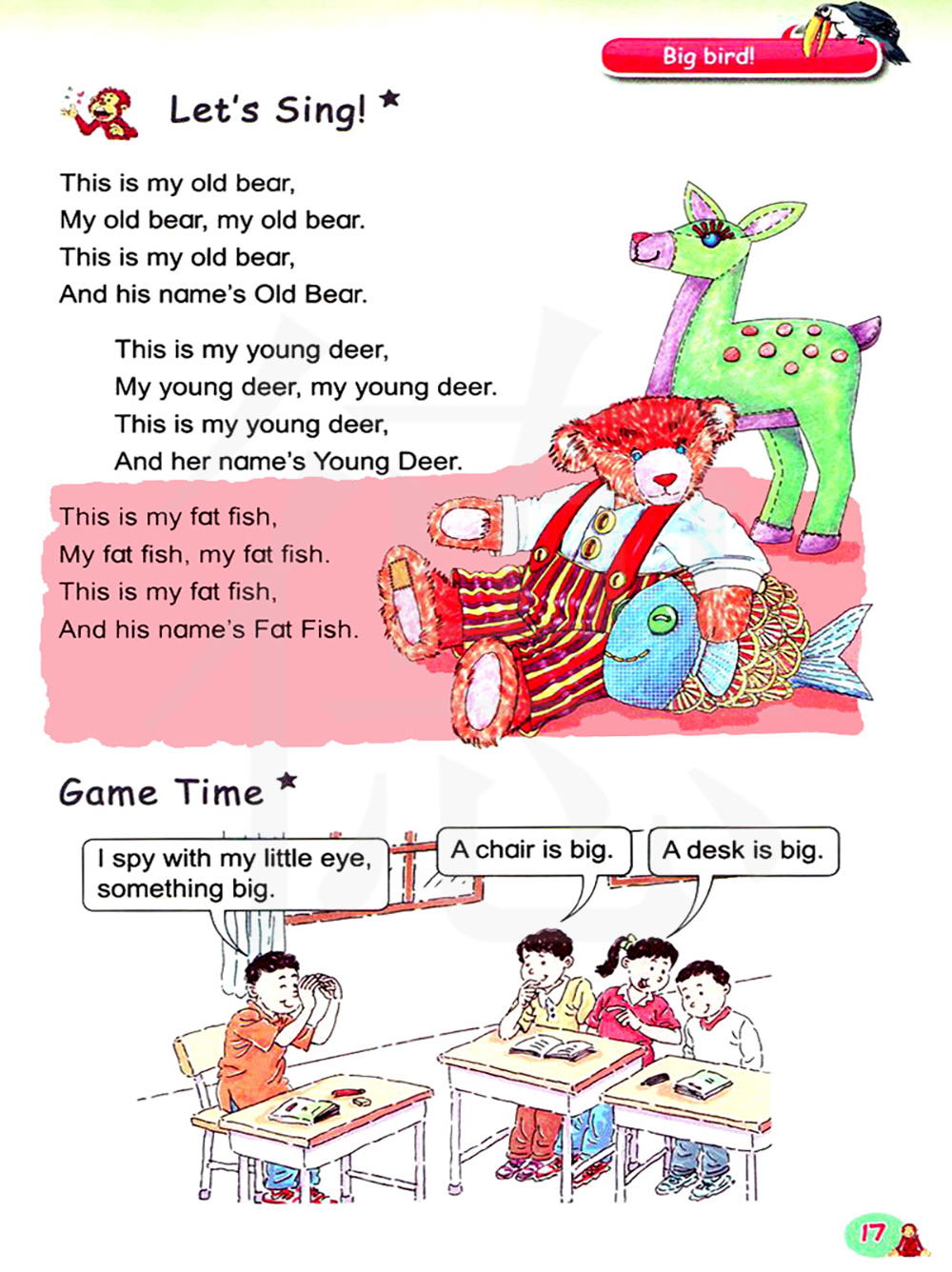 这是我的老熊,我的老熊,我的老熊。这是我的老熊,他的名字叫老熊。这是我的年轻的鹿,我的年轻的鹿,我的年轻的鹿。这是我的年轻的鹿,她的名字叫年轻的鹿。这是我的胖鱼,我的胖鱼,我的胖鱼。这是我的胖鱼,他的名字叫胖鱼。