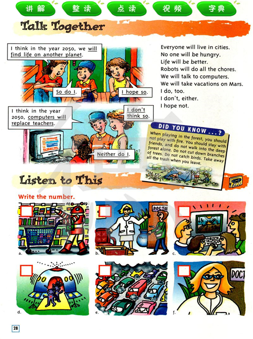 每个人都生活在城市里。将不会有饥饿,生活会变得更好。机器人会做所有的家务。我们会跟计算机讲话。我们将在火星上度假。我也想,我不这样想,我不希望如此。